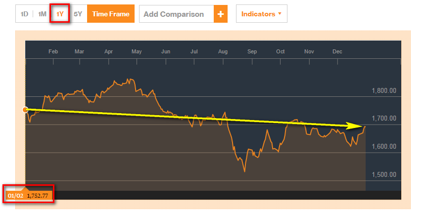 Pelabur emas kata “apedehal”. Tengok graf pergerakan harga emas berikut sepanjang tahun 2015: